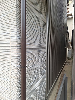 こちらは隣家との通路。土壁のお家なので既存のトタン板を交換しました。あまり目立たない部分の外壁とはいえ 玄関側のサイディングはお施主様もかなりこだわって選んで頂いたので、ここはシャンパンゴールドの波板を監督に無理言って施工してもらいました。窓色に合わせてきれいに納まりました。