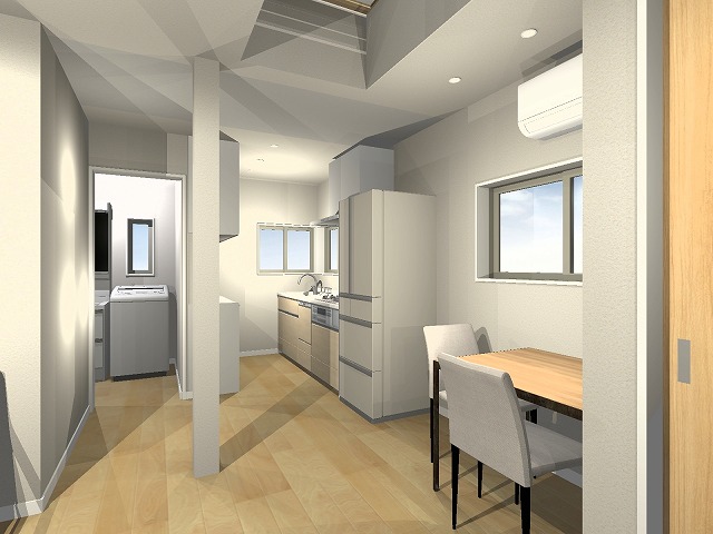 完成イメージ。片側連棟、反対側も隣家が近く、部屋の中央にほとんど自然光がない状況だったので、2階の廊下床にFRPグレーチングを入れて採光を採る計画に。