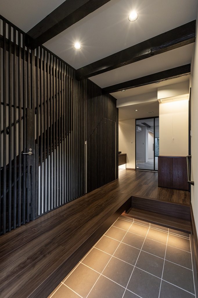 玄関は既存の和の趣き残しながら、モダンな要素を組み合わせました。