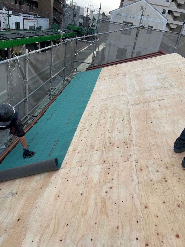 防水材であるアスファルトルーフィングを敷いきます。