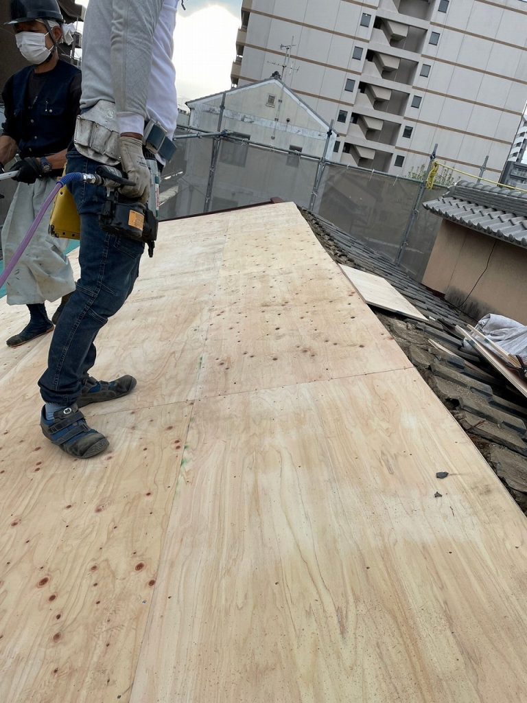 屋根材の下地として構造用合板を張ります。