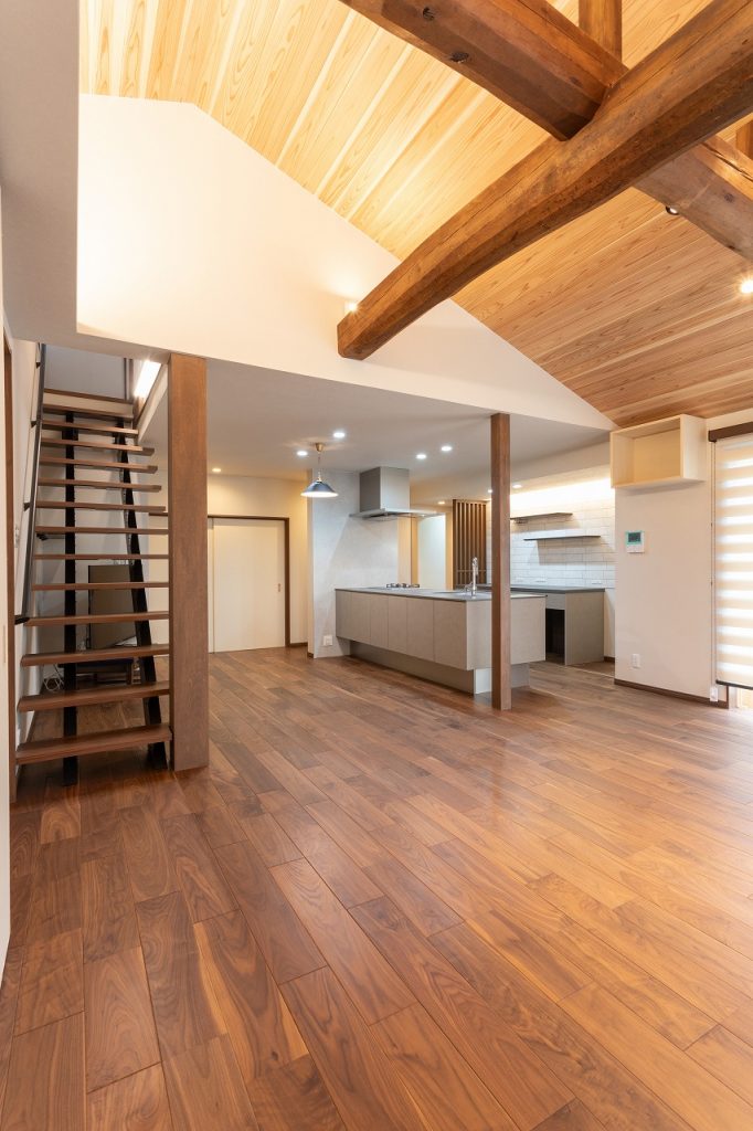 天井高を活かし、天井裏に眠っていた立派な梁を見せたLDK。
