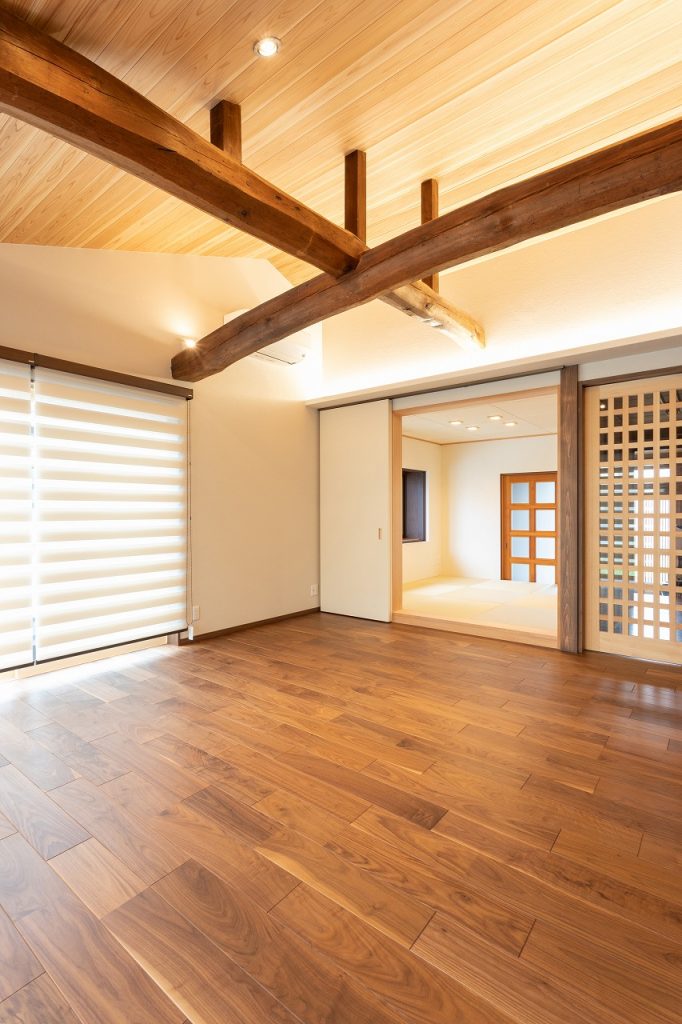 天井高をいっぱいにとり、天井裏に隠れていた立派な梁がお目見え。