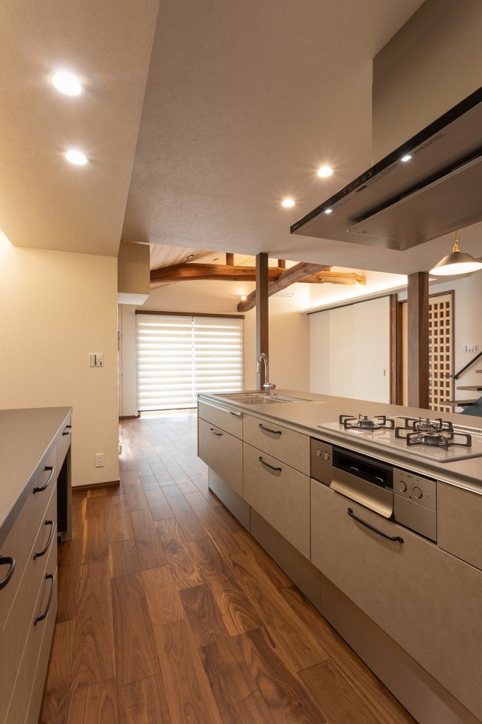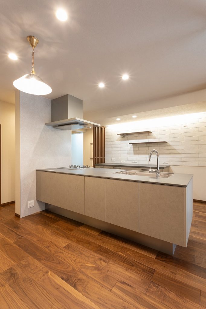 造作の間接照明が奥行きを生み、PanasonicのLクラスキッチンは収納量まで想定して引き出しや扉を選定しました。