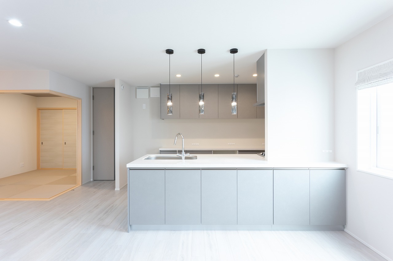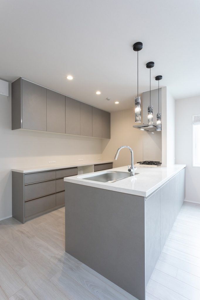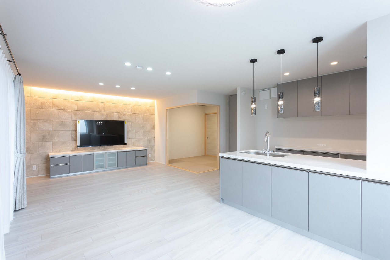 広い空間を美しく魅せるシンプルモダンスタイルで、キッチン、TVボート、洗面キャビネットはハンセムをご採用。