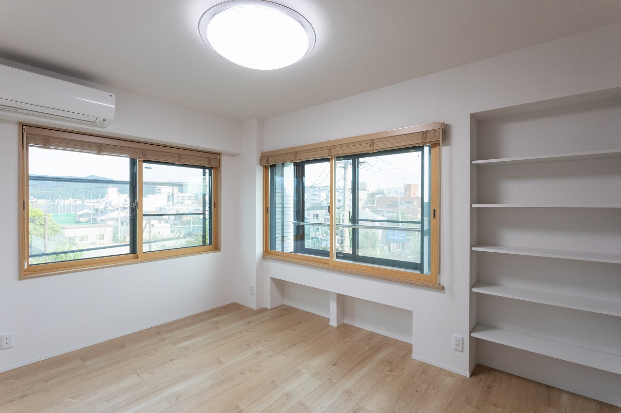 出窓の下の空きスペースには本棚、右側のスペースに稼働棚を設けて収納量もアップしました。