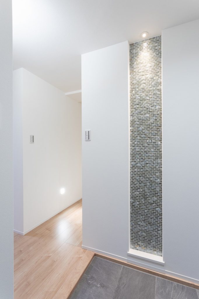 玄関から上階へと続く長い廊下玄関ホールにはアイポイントとなるニッチを設け、廊下は単純なダウンライトではなく足元を照らす照明でいい雰囲気を演出しております。