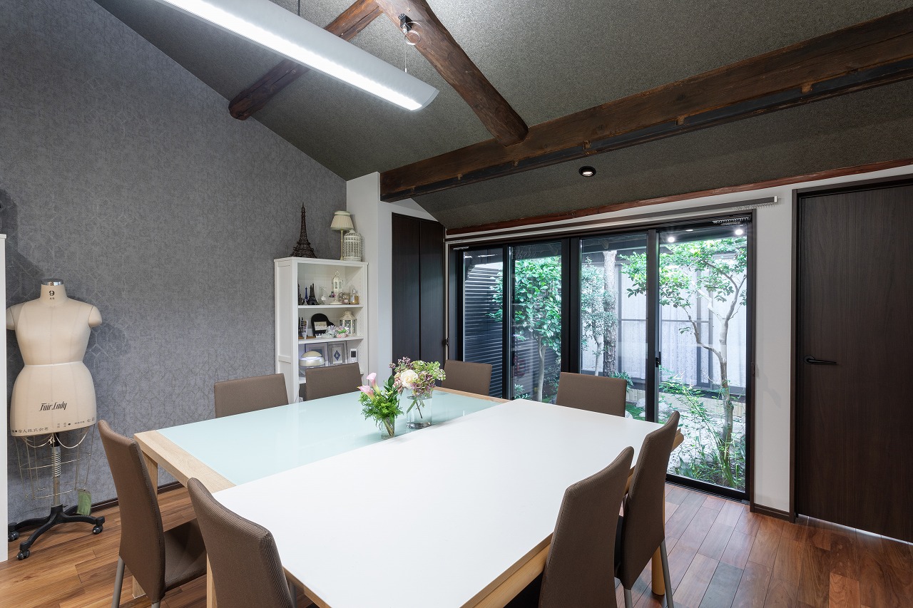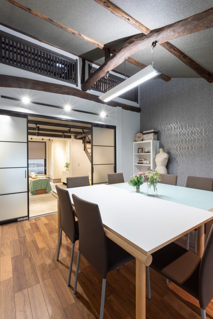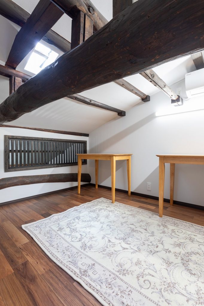 内装は、天井撤去で空間を大きく取りながら、「京町屋」のアイコンとも言えるゴロンボの梁を露出、和の雰囲気の漂うアトリエに生まれ変わりました。