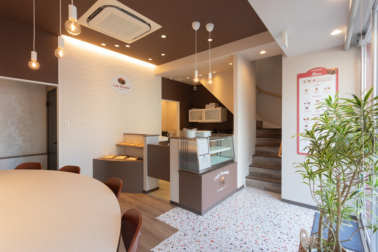 商品の世界観が一目で伝わるよう、素材選びを「ブラウニーのイメージ」に寄せて統一。入口はカラフルなタイルにすることで、入店時の期待感を高める工夫をしています。厨房は水を流せる床材を選び、作業のしやすさにもこだわりました。