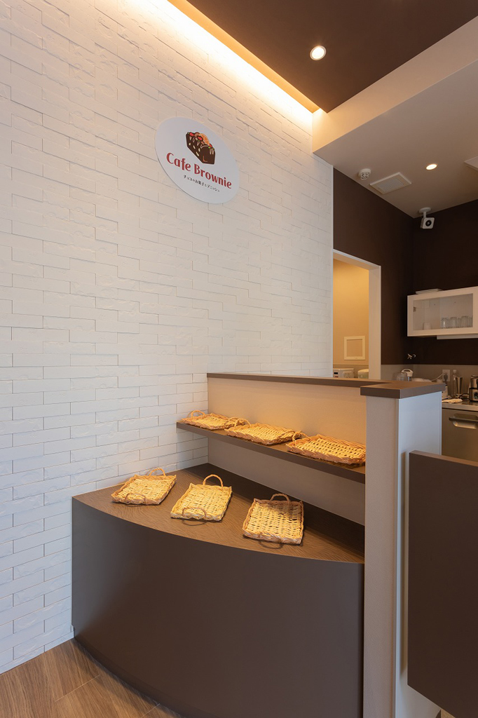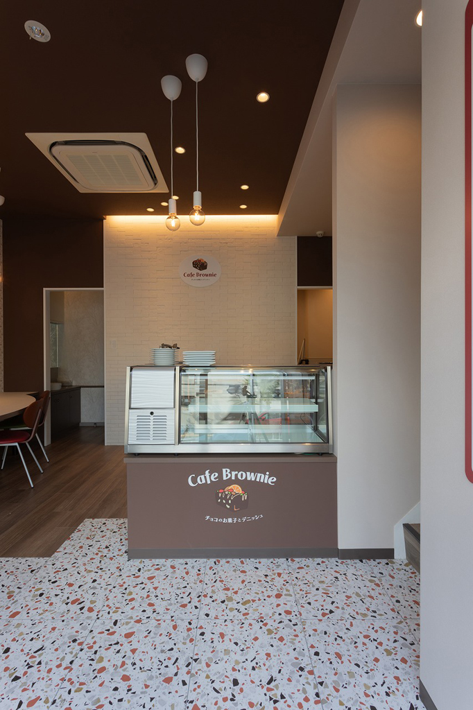 ブラウニーとデニッシュのカフェをリノベーション。ココアやフルーツ、ホワイトチョコを連想させる色柄で、クロスと床をコーディネートしました。オープンカウンターに並んだお菓子がおいしそうに見えるよう、照明計画にもこだわっています。