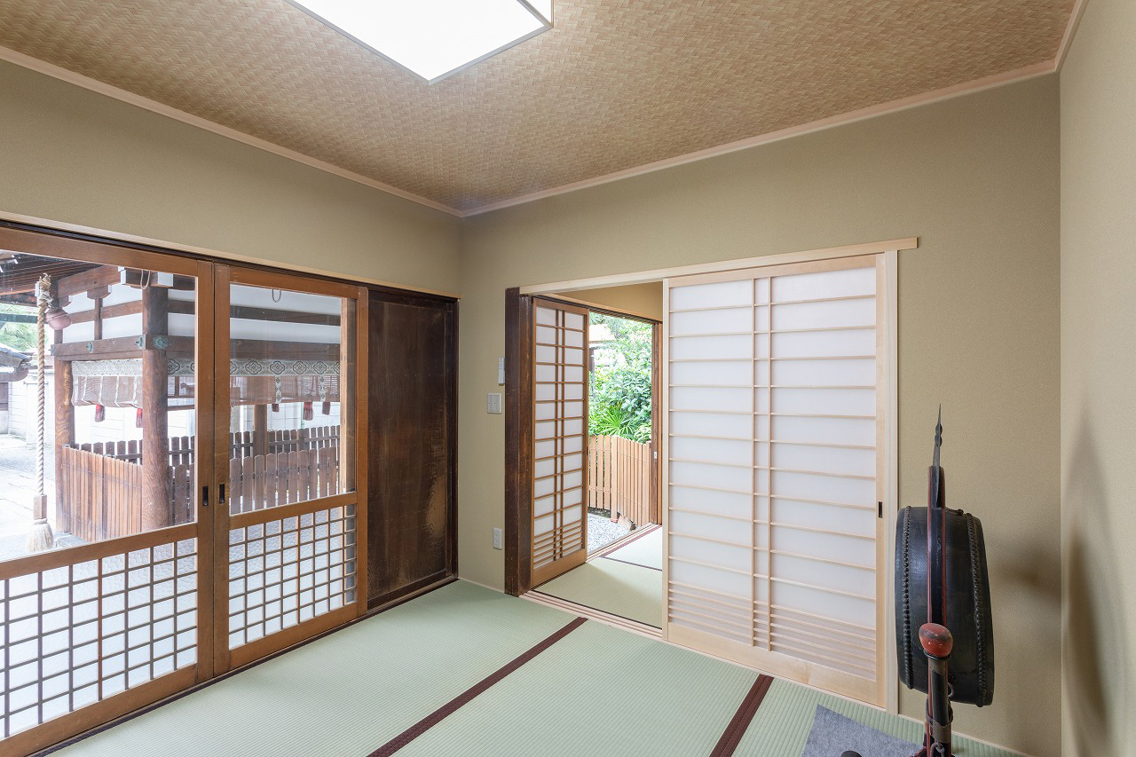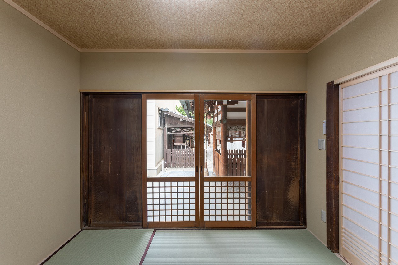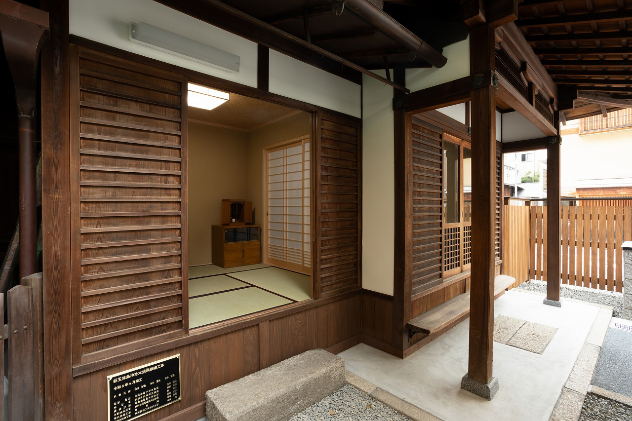 京都市下京区・新玉津島神社様。社務所や賽銭場などが沈下していた建物を、外装・内装まで含めて改修。賽銭箱の傾きも修正し、外壁は一部を塗り替えました。古い建具も再利用し、歴史の趣を残したリノベーションです。
