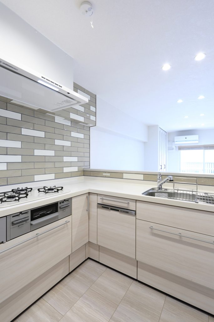 壁付けだったキッチンを対面に替え、家族の会話が生まれる配置にしました。腰板は床に合わせたバニラ色、白木目の扉で明るく統一しています。