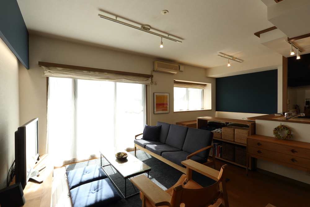 既存の間仕切りを取り払いワンルームに。明るい木の床に、淡いブルーグリーンのアクセントが映えるマンションリノベ。