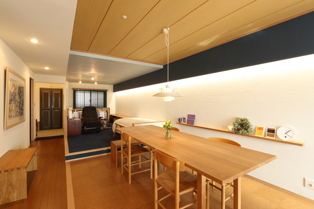 それぞれのスペースは、天井や床の高低差、K様の好みの素材や色などで変化をつけてゾーニング。