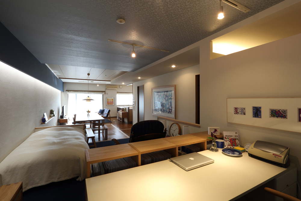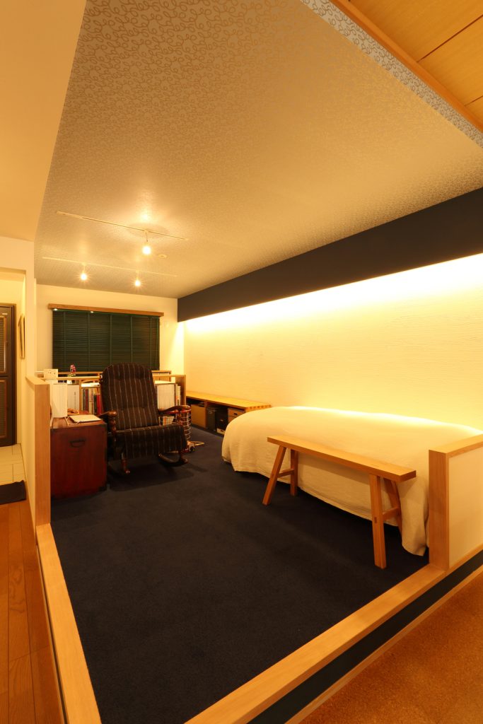 寝室は天井を下げ、床を高くして、落ち着いた雰囲気に。